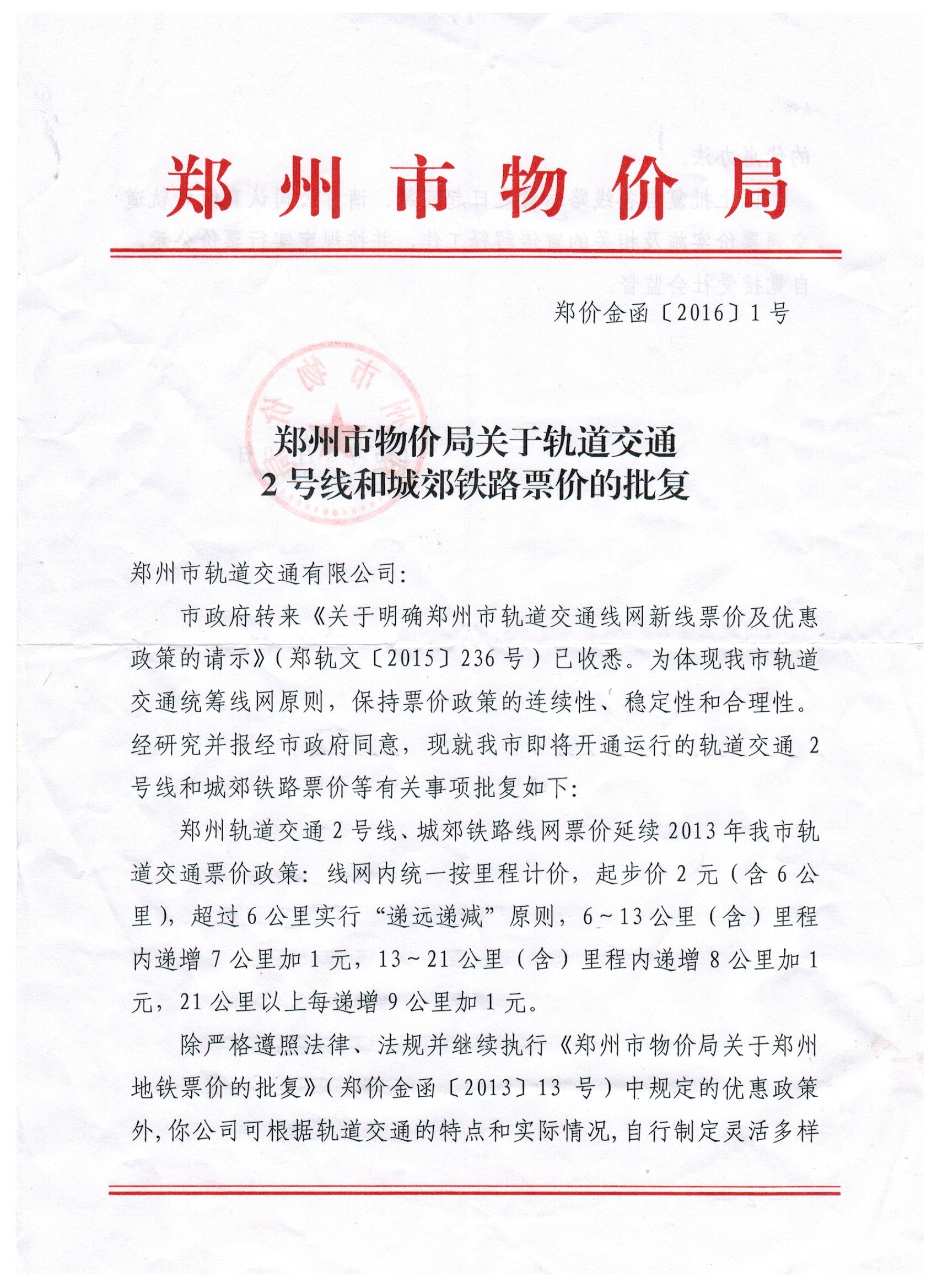 鄭州市物價(jià)局關(guān)于軌道交通2號(hào)線和城郊鐵路票價(jià)的批復(fù)